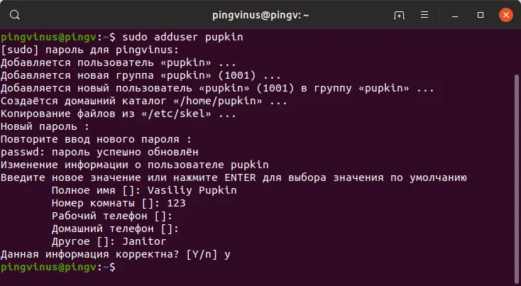 The system will ask a few questions: first, it will ask you to come up with a password for the new user (again, a strong one!), and then it will offer to enter additional information (name, phone, etc.) – this can be skipped by simply pressing Enter.